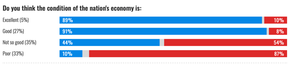 En tredjedel av USA’s befolkning upplever ekonomin som ”Poor” och bland dessa röstade 87% på Trump i valet 2024. Rött. (NBC NEWS Exit Pools)